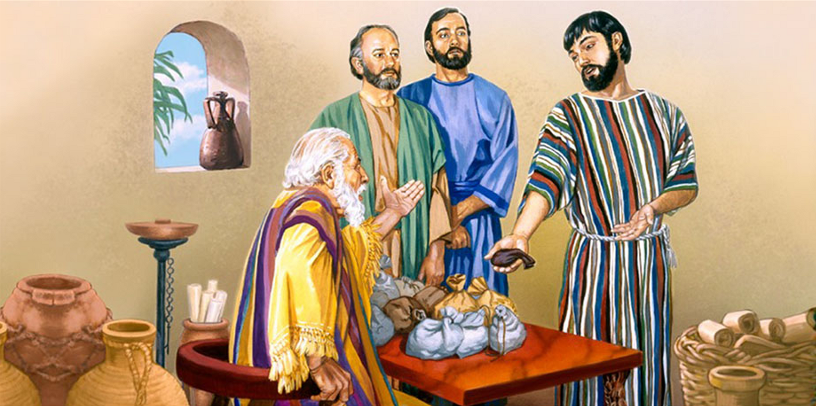 Один богатый человек, отправляясь в далёкую страну, поручил рабам своё состояние. Одному он дал пять талантов, другому два, а третьему один. Первые два раба пустили полученное серебро в оборот и получили прибыль, а третий раб закопал полученный талант в землю.